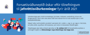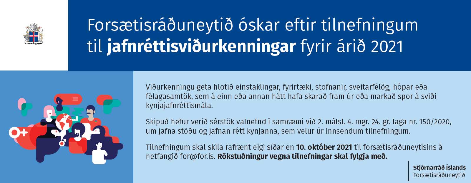 Forsætisráðuneytið óskar eftir tilnefningum til jafnréttisviðurkenningar fyrir árið 2021. Viðurkenningu geta hlotið einstaklingar, fyrirtæki, stofnanir, sveitarfélög, hópar eða félagasamtök, sem á einn eða annan hátt hafa skarað fram úr eða markað spor á sviði kynjajafnréttismála.