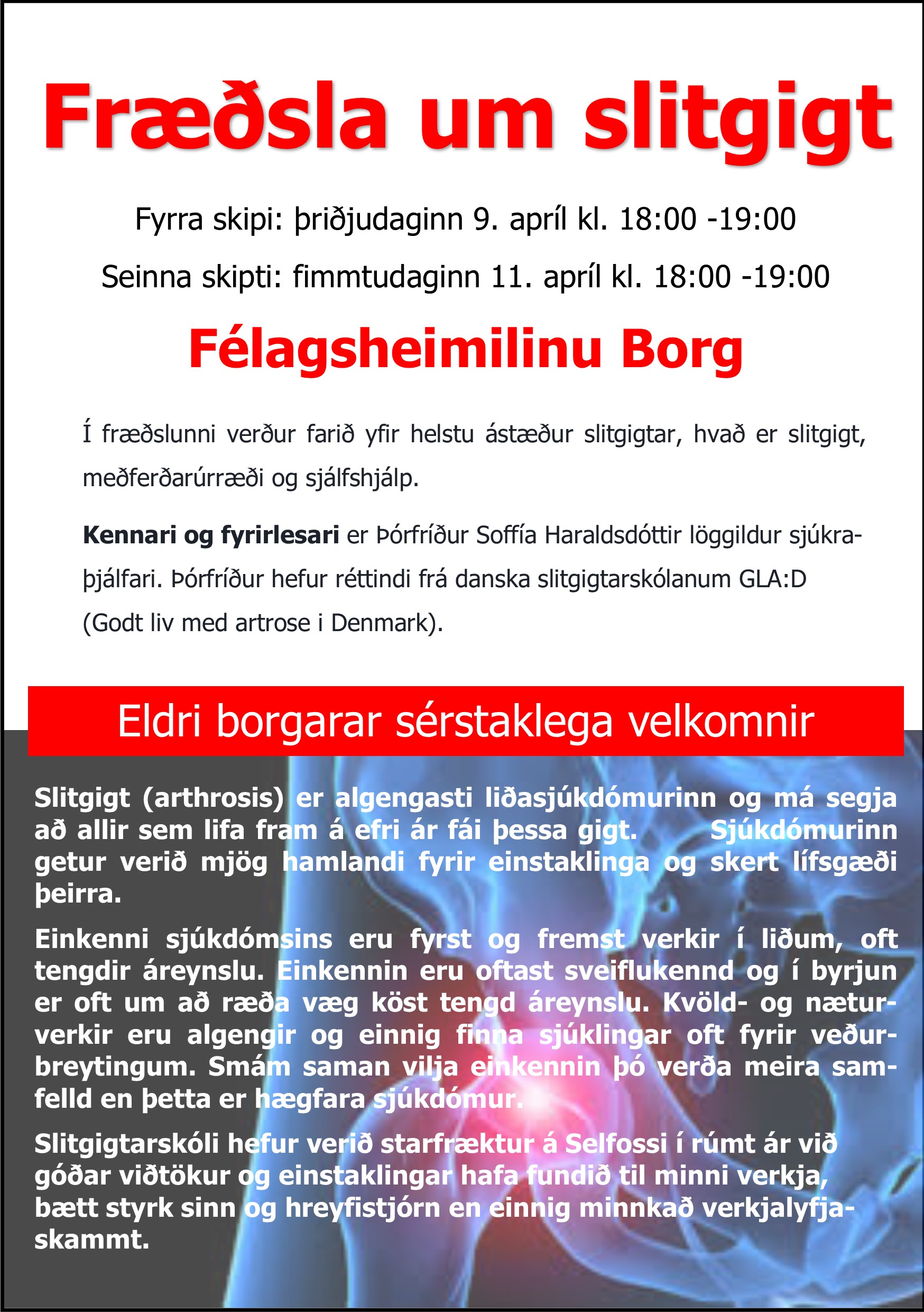 Fræðsla um slitgigt í félgsheimilinu Borg