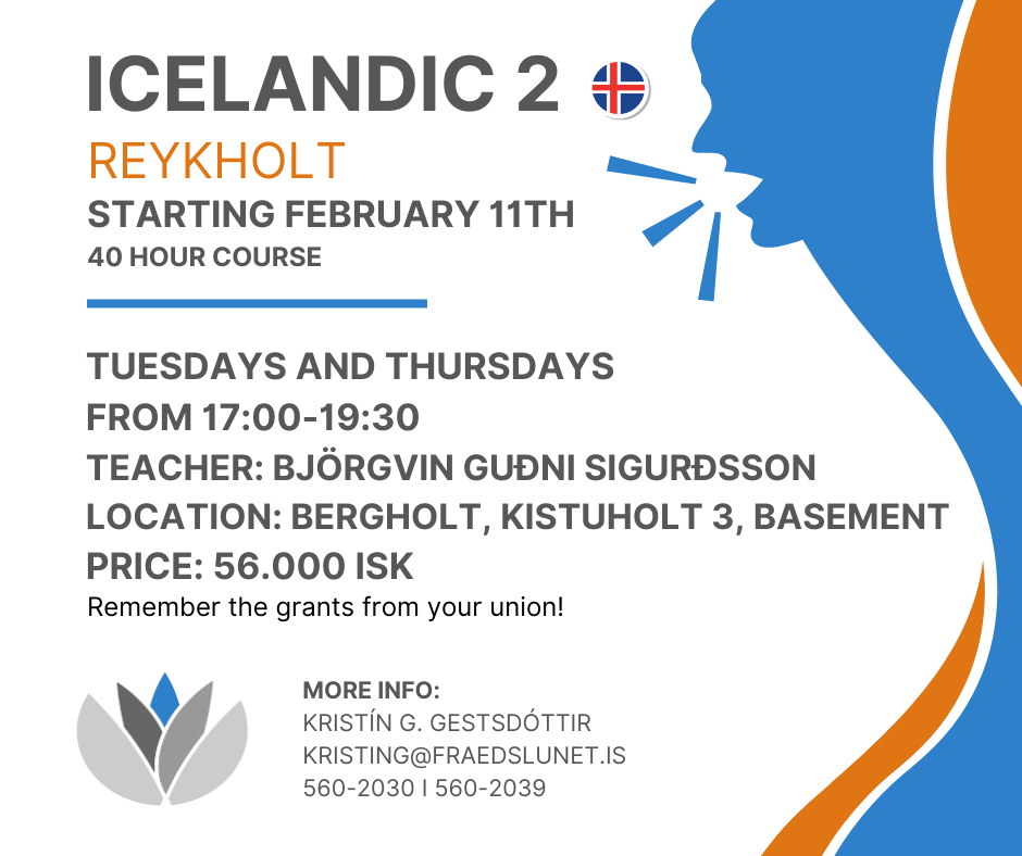 The course is intended for those who have completed Icelandic 1 or have become familiar with the language and want to learn more. Trade unions pay up to 80% of the cost price of the course upon presentation of an invoice. https://fraedslunetid.is/icelandic-courses-level-2-islenska-2/