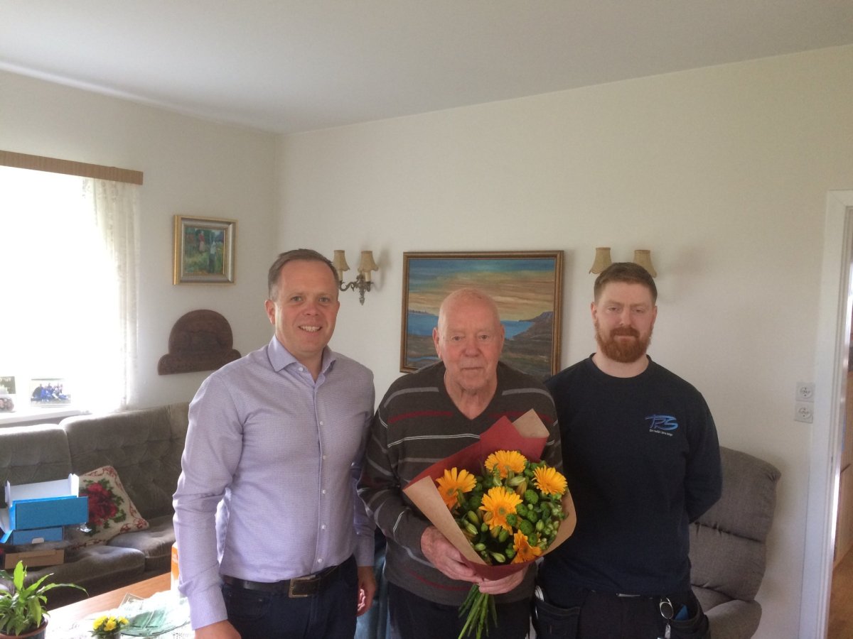 Lagning ljósleiðara í Bláskógabyggð gengur vel en fyrsti viðskiptavinur Bláskógaljóss var tengdur 17. júlí. Það var skemmtileg tilviljun að sá fyrsti til að tengjast var Sigurður Þorsteinsson elsti íbúi Bláskógabyggðar, en Sigurður er 96 ára. Í tilefni af ljósleiðaratengingunni afhenti Helgi Kjartansson, oddviti Bláskógabyggðar, Sigurði blómvönd. Með á myndinni er Hannes Arnar Viðarsson, tæknimaður hjá TRS.