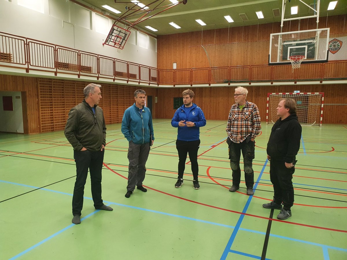 Það stendur mikið til í íþróttahúsinu á Laugarvatni. Þar mun verða lagt nýtt parketgólf í miklum gæðum. Verkefnið var boðið út snemma á árinu. Gengið var til samninga við fyrirtækið Sporttæki um verkefnið. Efni og vinna er innifalið í því. Verkið er í þann veginn að hefjast. Á myndinni sem tekin var á verkstað má sjá frá hægri Lúkas frá framleiðanda gólfsins, Þröst frá Sporttækjum, Elías umsjónarmann íþróttahússins, Sigurð frá Sporttækjum og Gunnar hjá heilsueflandi samfélagi.