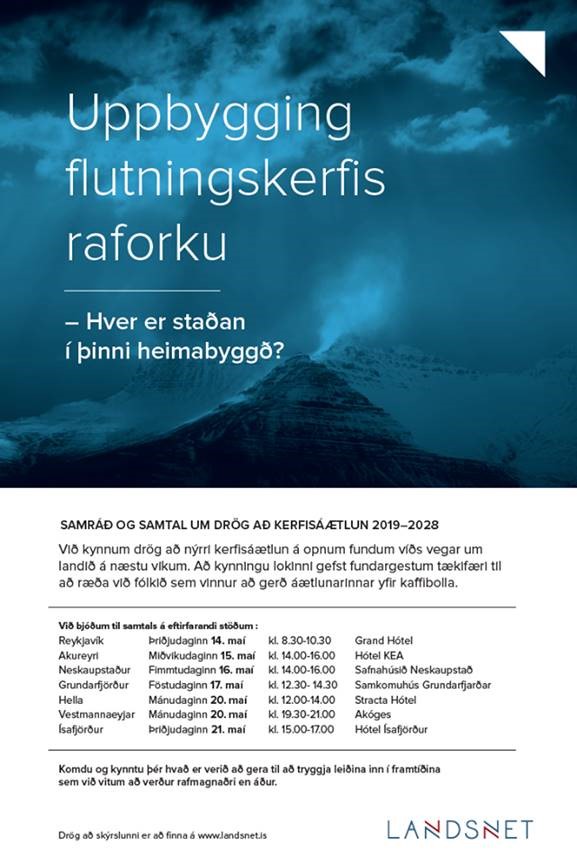 Kynningarfundir mánudaginn 20.maí á Hellu og í Vestmanneyjum og þar sem kynnt verða drög að kerfisáætlun Landsnets 2019 ? 2028 sem og umhverfisskýrslu vegna áætlunarinnar. Auk hefðbundinnar kynningar á kerfisáætluninni verða á fundinum fjöldi sérfræðinga sem unnið hafa að kerfisáætlun en þeir munu veita upplýsingar og svara því sem fólki fýsir að vita um áætlunina og það sem er kannski ekki síður mikilvægt hlusta á það sem þið hafið fram að færa.