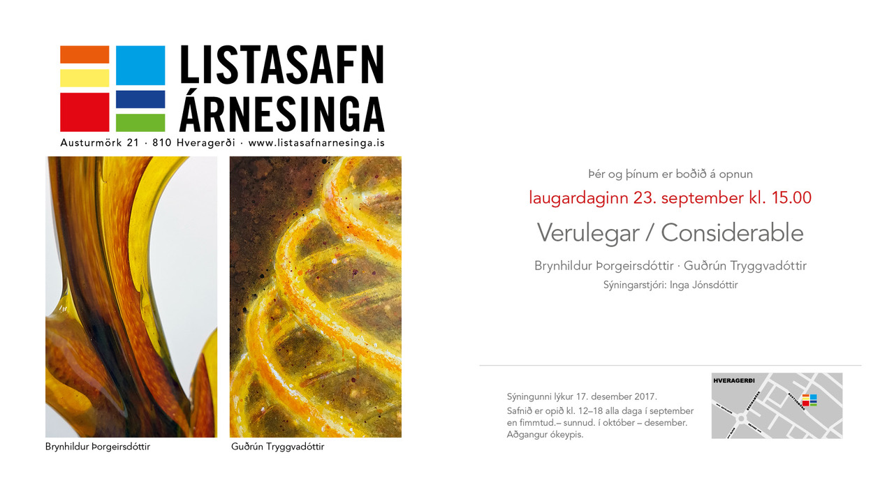 Laugardaginn 23. september kl. 15 verður sýningin, Verulegar, Brynhildur Þorgeirsdóttir · Guðrún Tryggvadóttir, opnuð í Listasafni Árnesinga í Hveragerði.