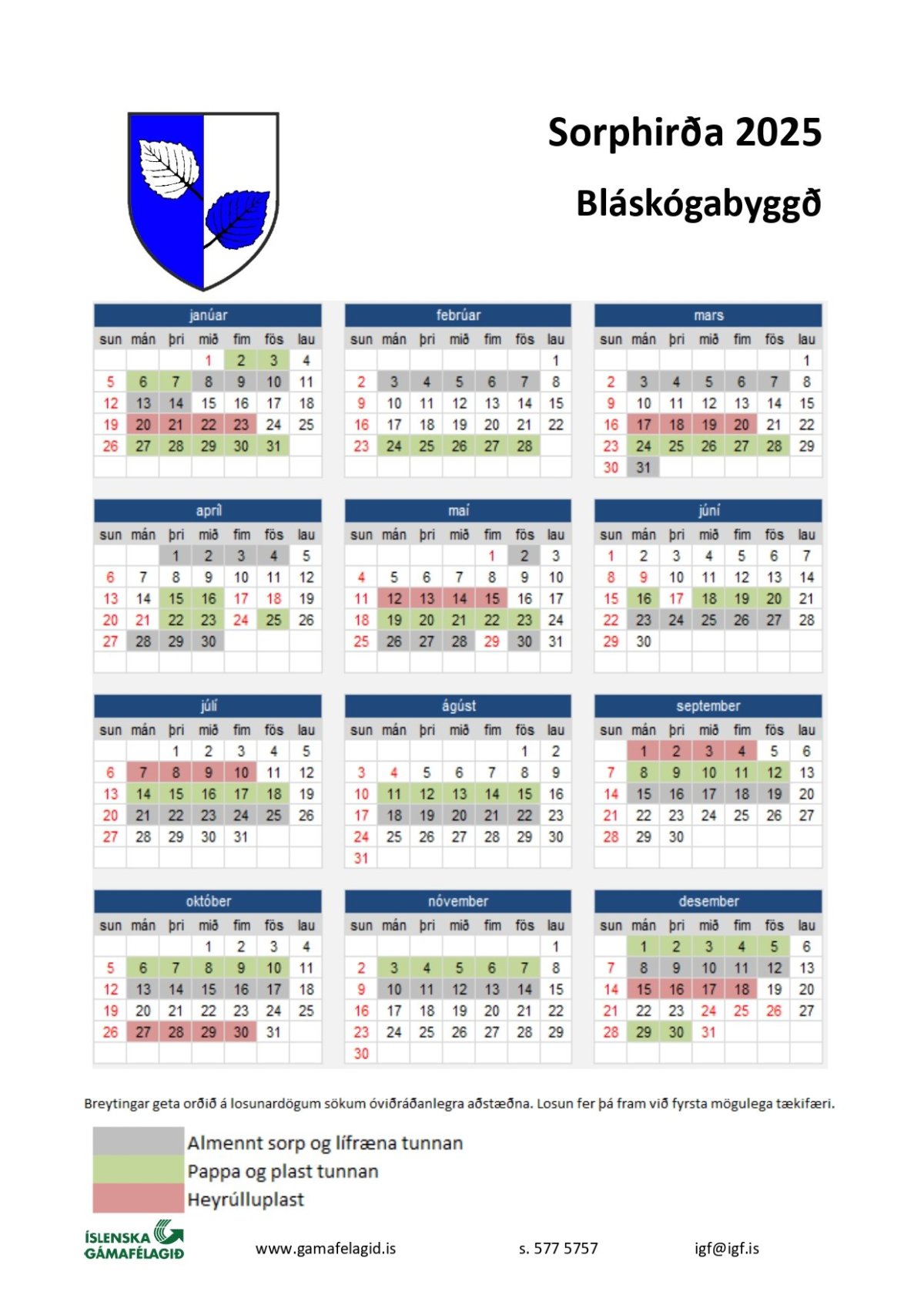 Nýtt sorphirðudagatal tekur gildi nú um áramótin. Breyting verður á tíðni sorphirðu við heimili skv. ákvörðun sveitarstjórnar. Allir úrgangsflokkar verða teknir á fjögurra vikna fresti í stað þess að almennur og lífrænn úrgangur hefur verið tekinn á 3ja vikna fresti og pappír og plast á sex vikna fresti. Vonir eru bundnar við að þetta fyrirkomulag leiði til bættrar flokkunar þar sem minni líkur eru á að ílát yfirfyllist.