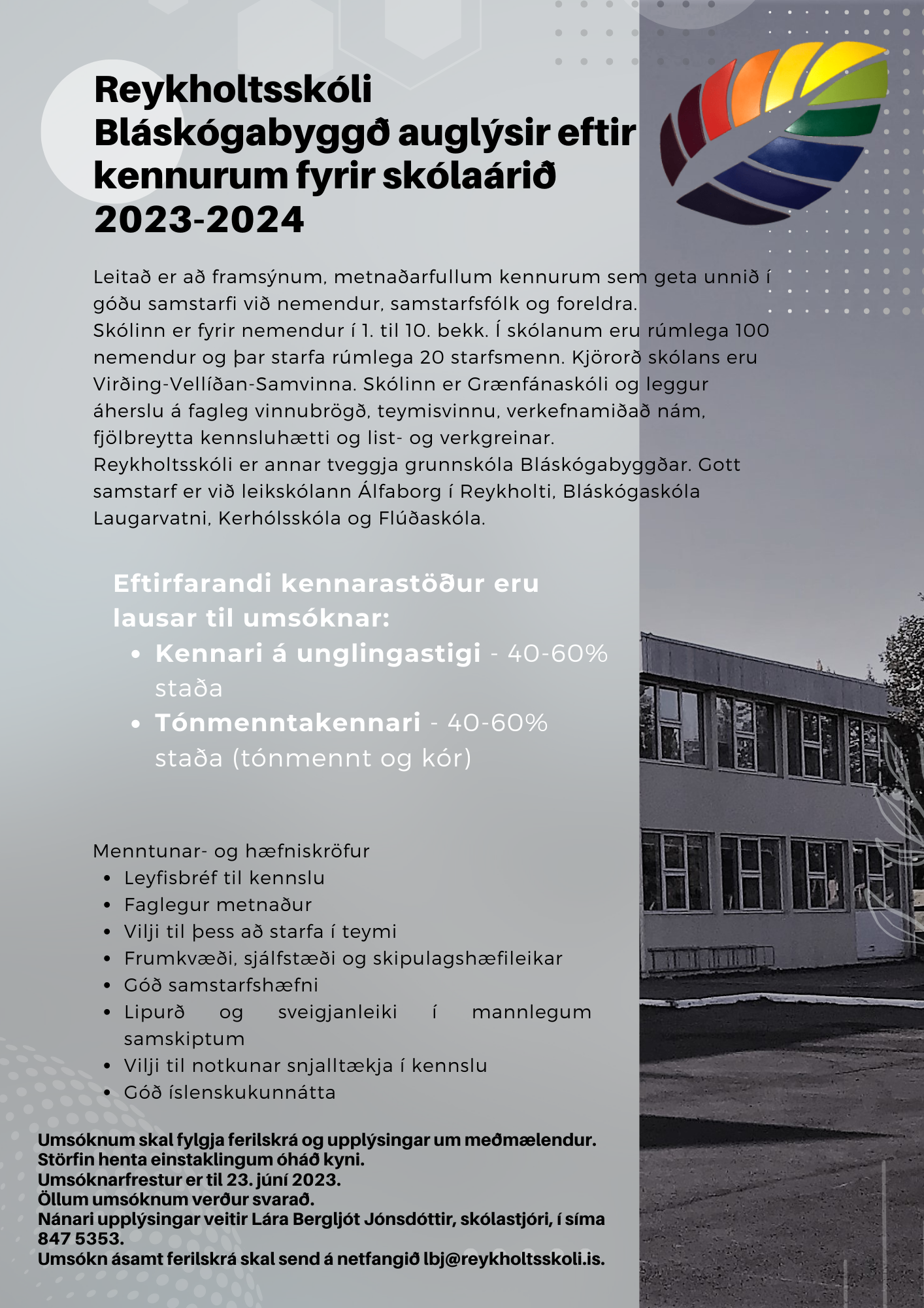 Reykholtsskóli Bláskógabyggð auglýsir eftir kennurum fyrir skólaárið 2023-2024