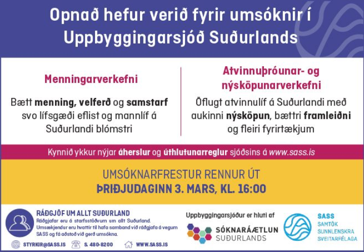 Ertu með frábæra hugmynd? Núna er aðeins vika þar til lokað verður fyrir umsóknir í Uppbyggingarsjóð Suðurlands. Sæktu um fyrir 3. mars, kl. 16:00.