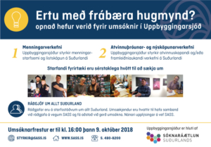Sjóðurinn hefur það hlutverk að veita verkefnastyrki á sviði nýsköpunar og menningar á Suðurlandi.