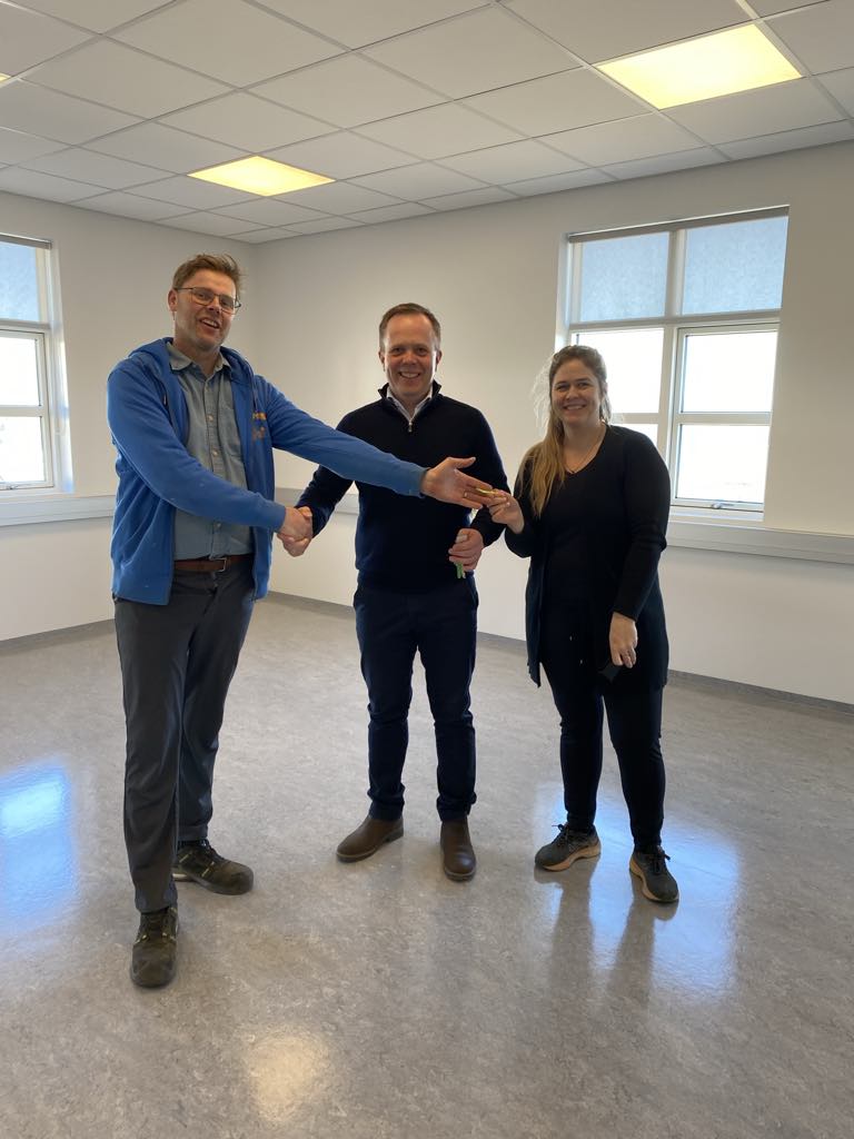 Starfsemi skipulags- og byggingafulltrúaembættisins á Laugarvatni (UTU) hefur nú flutt í nýtt og glæsilegt húsnæði á Laugarvatni. Skrifstofan hefur frá stofnun embættisins verið í húsnæði Bláskógabyggðar að Dalbraut 12 á Laugarvatni. Það húsnæði var komið til ára sinna og þarfnaðist mikils viðhalds, til að standast þær kröfur sem gerðar eru til skrifstofuhúsnæðis. Nýja húsið sem er staðsett að Hverabraut 6 er glæsilegt í alla staði og er gamla Smíðahúsið á Laugarvatni fyrirmyndin. Það voru Selásbyggingar sem byggðu húsnæðið og er Hákoni Páli Gunnlaugssyni, eiganda fyrirtækisins þökkuð góð störf. Eftir er að ganga frá lóðinni og aðkomu að húsnæðinu en það verður gert í sumar. Nýja húsnæðið að Hverabraut 6 verður fljótlega opið fyrir almenning til sýnis, en það verður auglýst sérstaklega á miðlum sveitarfélagsins. Á myndunum eru Hákon Páll Gunnlaugsson, eigandi Selásbygginga, Helgi Kjartansson, oddviti Bláskógabyggðar og Nanna Jónsdóttir, skrifstofustjóri UTU, er Hákon Páll afhenti lykla að nýja húsinu. Eigandi hússins er Bláskógabyggð, en gengið hefur verið frá leigusamningi við UTU.