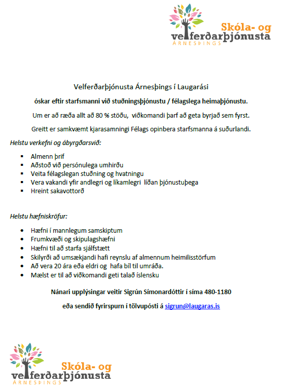 Velferðarþjónusta Árnesþings í Laugarási óskar eftir starfsmanni