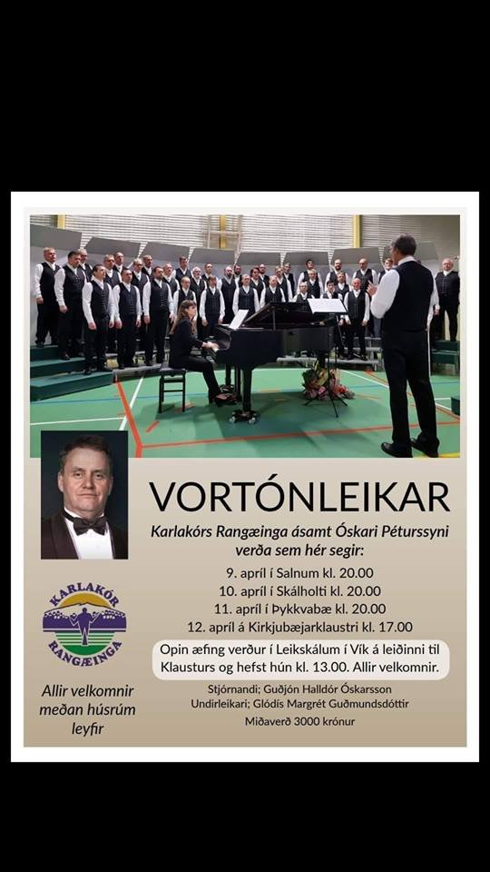 Vortónleikar Karlakórs Rangæinga ásamt Óskari Péturssyni. Undirleikari er Glódís Margrét Guðmundsdóttir. Stjórnandi er Guðjón Halldór Óskarsson. Miðar eru seldir við hurð og er miðaverð: 3000 kr
